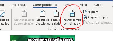 Luego en la pestaña de menú correspondencia debemos dirigirnos al icono de insertar campo combinado para aquí insertar los encabezados de las columnas de excel.