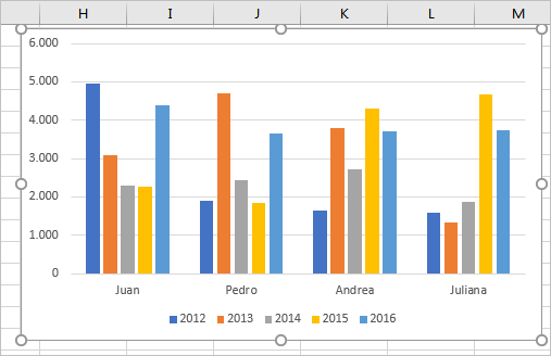 El gráfico quedaría a la inversa del anterior donde tenemos las ventas por vendedor y cada color es un año.